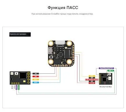 Компактный полетный контроллер формата Mini Pro (28.5x28.5 мм) на базе процессора STM32F722RET6 и современного гироскопа ICM-42688-P. Ключевая особенность модели — встроенная функция PASS с двумя проходными каналами (PASS1, PASS2), которые значительно упрощают подключение видеопередатчиков (например, TBS Unify Pro32 Nano) и приемников за счет прямой передачи питания и видеосигнала. Контроллер оснащен мощным BEC 5В/3А, 4 портами UART, 16 Мб памятью для черного ящика и выделенным выходом управления камерой.