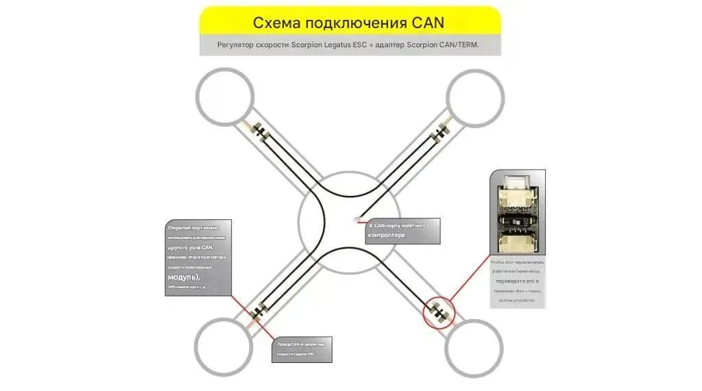 Такое подключение упрощает построение сети и минимизирует длину соединений между узлами. Без этого адаптера может быть сложно подключить регулятор как узел в системах UAV с длинными лучами.