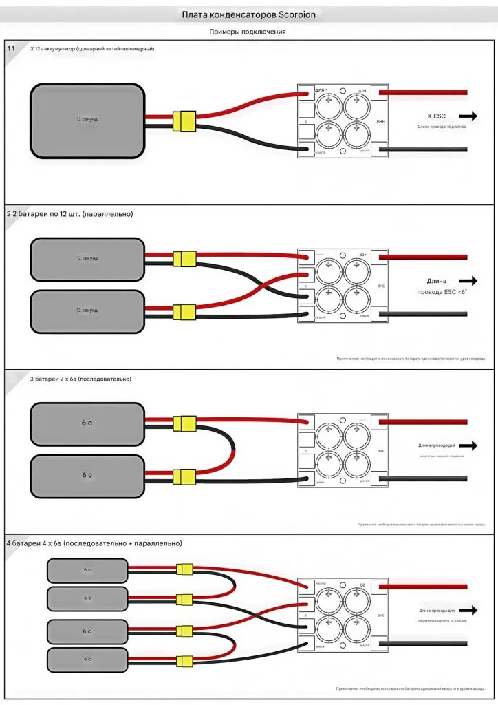 На крупных БПЛА длинные провода между аккумулятором и регулятором скорости (ESC) часто неизбежны. Такая длина проводов вызывает помехи и пульсации напряжения, которые могут повредить ESC. Низкоимпедансный конденсаторный модуль Scorpion 80V предназначен для HV-ESC (до 14S LiPo) и используется в конфигурациях, где длина проводов питания к ESC превышает 150 мм и может достигать 1,5 м.