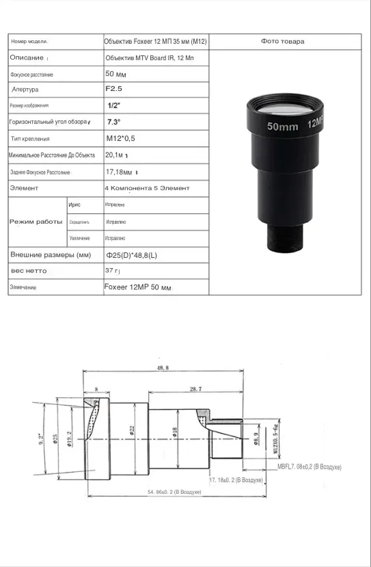 - Совместимость: Камеры Foxeer Legend 4K Scope Camera и другие модели с креплением M12 x 0.5