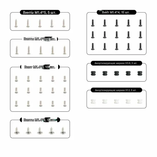 По запросуУниверсальный набор крепежа и демпферов, винты M1.2×4 / M1.4×5, демпферы 0.8/1.2/1.8 мм (60+60 шт.)
