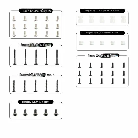 По запросуУниверсальный набор крепежа и демпферов, винты M1.2×4 / M1.4×5, демпферы 0.8/1.2/1.8 мм (60+60 шт.)