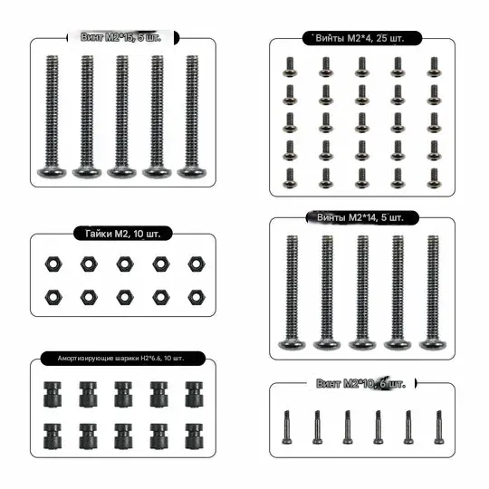 По запросуУниверсальный набор крепежа и демпферов, винты M1.2×4 / M1.4×5, демпферы 0.8/1.2/1.8 мм (60+60 шт.)