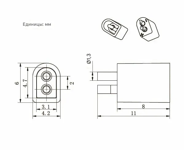 - Габариты (Female): 6.0 × 4.2 × 8.3 мм