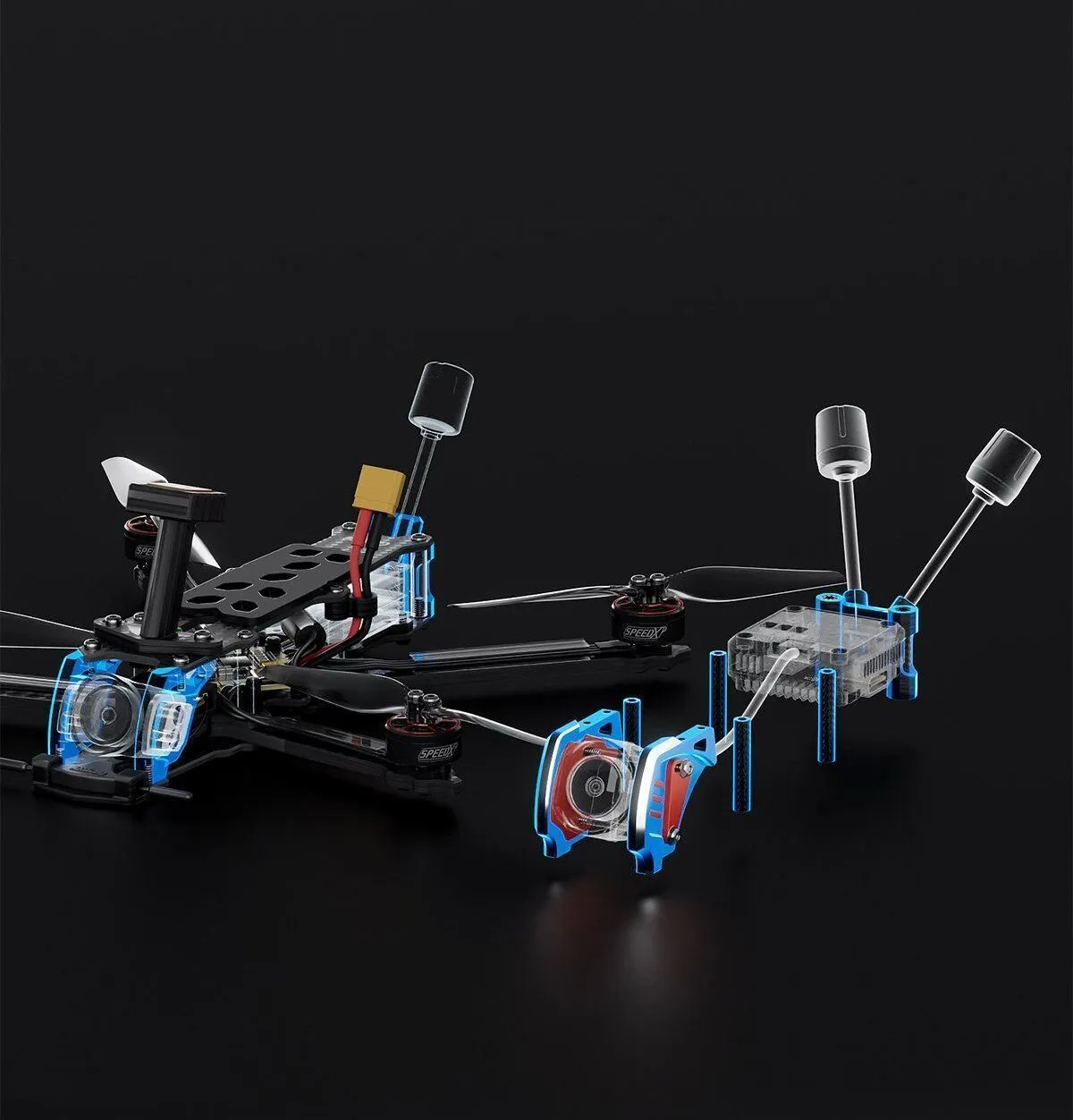- алюминиевые детали рамы, антивибрационное крепление камеры, держатель антенны VTX, стойки, крепежные винты
