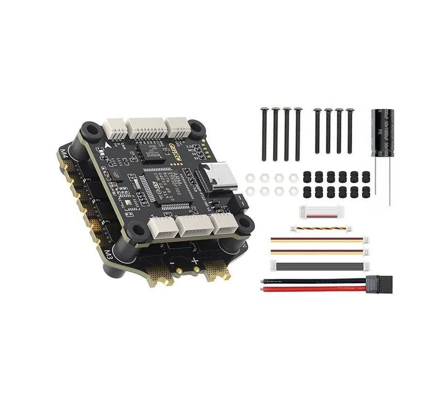 Стек GEPRC TAKER F722 BLS 65A V2 представляет собой высокопроизводительную систему управления, объединяющую полетный контроллер GEP-F722-HD V2 и 4-в-1 регулятор TAKER H65 8S BLS 65A. Стек разработан для FPV-дронов классов 5–6 дюймов, требующих высокой производительности и надежности. Полетный контроллер оснащен процессором STM32F722, гироскопом ICM42688-P (SPI), встроенным барометром, Blackbox на 16 Мб, двумя независимыми BEC (5V@3A и 9V@2.5A ) и прямым подключением DJI Air Unit. Регулятор обеспечивает непрерывный ток 65A на каждый канал и пиковый 70A. Стек поддерживает питание 3–6S LiPo, оснащен 5 UART портами и встроенным LC-фильтром. Комплект включает все необходимые кабели, конденсатор, силовой кабель XT60 и крепежные элементы.