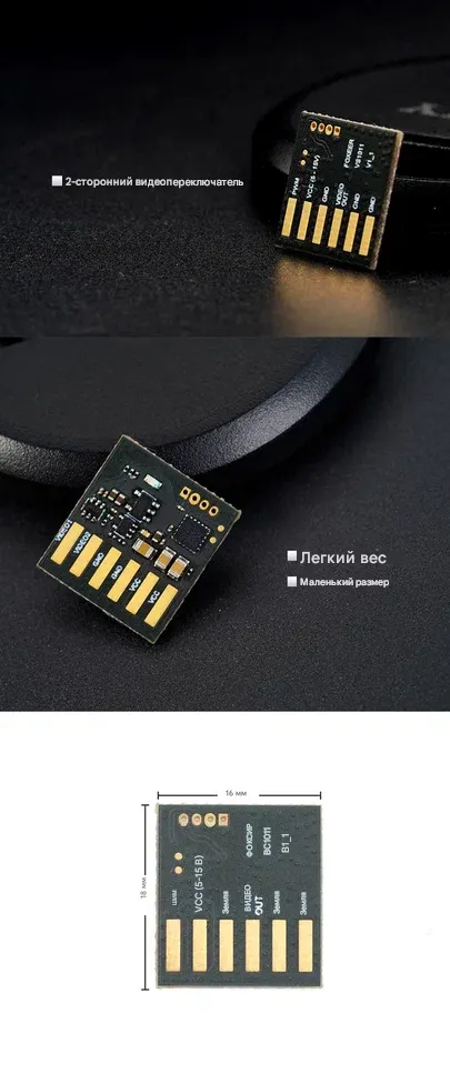 - Разъёмы на плате: Стандартные 3-pin контакты (Video, GND, 5V) для пайки или подключения кабелей