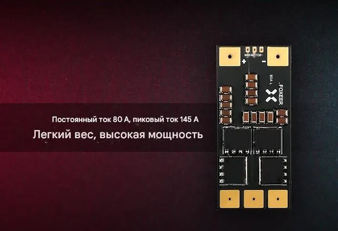Высокопроизводительный одноканальный регулятор оборотов для мощных гоночных, фристайл и специальных FPV-дронов. Модель построена на базе чипа F4 и импортных MOSFET-транзисторов, использует 8-слойную печатную плату для минимального сопротивления и эффективного теплоотвода. Обеспечивает непрерывный ток 80А и пиковый 145А при поддержке напряжения 4-8S, что делает его идеальным выбором для сборок с отдельными регуляторами на каждом луче.