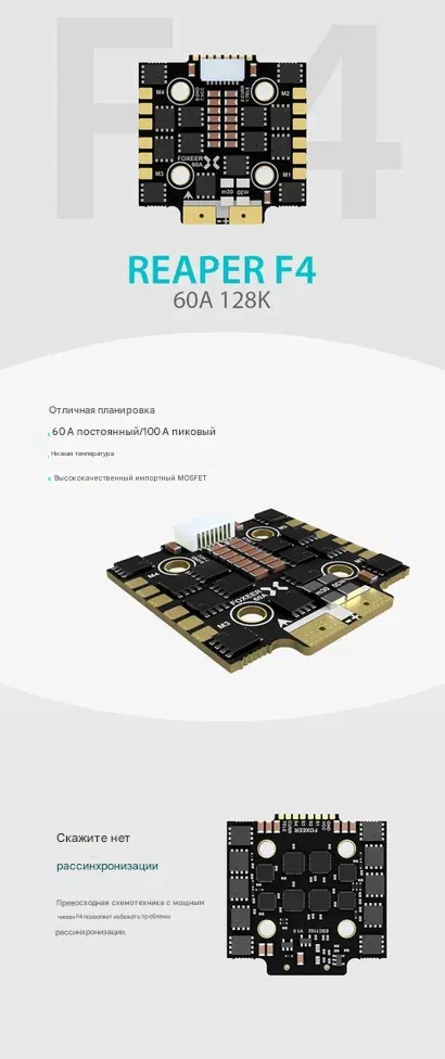 - Прошивка: BLHeli32 (FOXEER_ReaperM4IN1_F4_60A_128_Multi_32_9)